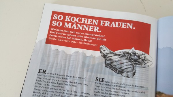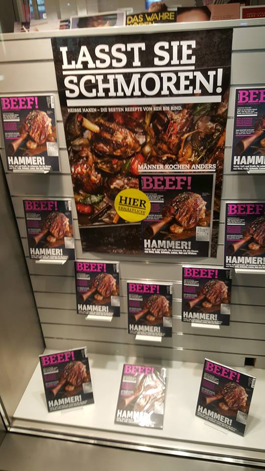 LV Das Zitat von Leo gefällt mir sehr gut. Ich möchte noch erwähnen, was ich über die Entstehungsweise solcher Lifestyle-Kochhefte weiß: Es gibt bei G+J zwar viele solcher Hefte für alle möglichen Zielgruppen aber bloß eine Rezeptredaktion im Haus. Das heißt, die beliefern Männer-Cooking genau so wie das Heft für Back-Omis oder den zurückgebliebenen Studi, der sich dann doch auch mal ein Koch-Magazin kauft, weil er vom vielen Wichsen hungrig wurde. Fakt aber: Alles aus einer Hand. Die jeweiligen Winzig-Redaktionen basteln halt die jeweilige Farbe um die Rezepte. Aber keineswegs erfinden hier haarige Bären schwitzend die Gerichte. Alles Kulisse. Apropos Kulisse: Jedes Magazin kann man eigentlich an seiner letzten Seite erkennen, die hat Paula ja auch schon erwähnt. Meist wird sich hier Humor oder eine Kolumne gehalten. BEEF! indes outet sich an dieser Stelle als lebloser Journo-Sweatshop. Die Rubrik dazu lautet: “So kochen Frauen. So Männer”. Dieser Differenz-Quatsch war Anfang der Nuller sogar RTL zu platt. Die stellten die Mario-Barth-verdächtige Show “Männer Mars / Frauen Venus” ein. RTL! Vor 15 Jahren! BEEF! hatte am Heftschluss aber garantiert weder Bock noch Kapazität sich was auszudenken, das noch mit der sonst herrschenden Esprit-Simulation mithielte. Das Ergebnis ist so unlustig und tot, das tut fast noch mehr weh als die ganzen sexy inszenierten Tierkadaver im Heft. Das schreibe ich im Lift nach unten besser – und ich wohne bloß im zweiten! Soll allerdings keine Bewerbung sein, ich arbeite ja auch nicht für die GEZ oder Glyphosat Inc. Aber Kids. wollen wir es nicht zu lang werden lassen. Euer Fazit. Was wollt ihr noch loswerden, wem empfehlt ihr den Titel?