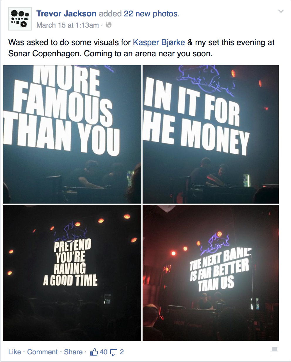 A few days ago, the wonderfully sarcastic Trevor Jackson, reported from his booking at Sónar Copenhagen, where he was doing visuals for Kasper Bjørke. His accurate if caustic commentatory on the nature of these huge dance events was spot on: a lot of blah-blah-blah and not so many ecstatic surprises.
