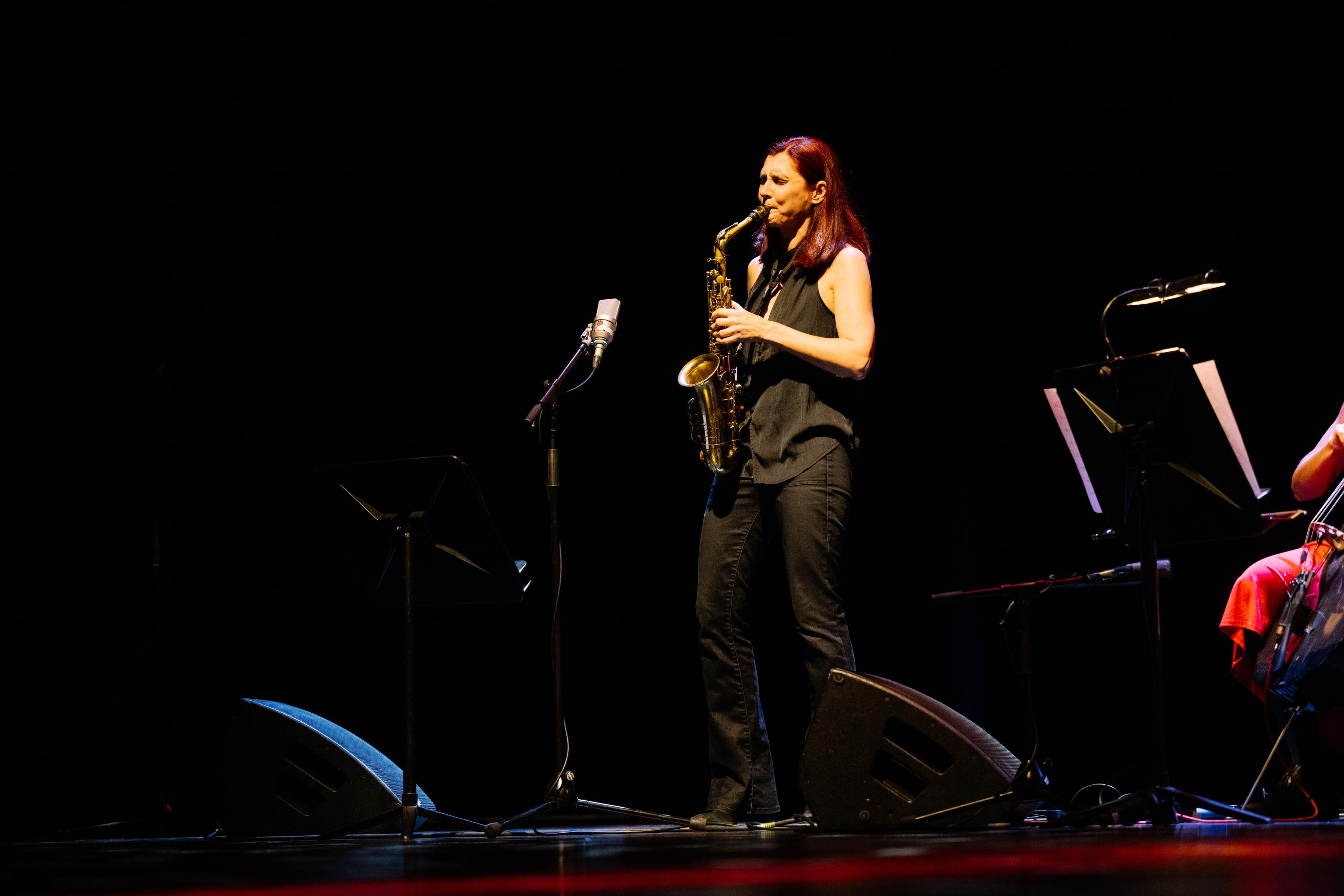 Ein Satz, der noch immer in mir nachklingt, als die Altsaxophonistin Angelika Niescier, die Violoncellistin Tomeka Reid und Schlagzeuger:in Eliza Salem die Bühne zum offiziellen Eröffnungskonzert betreten. Vier Tage zuvor haben die drei ein wunderbares Trioset aus drei Songs sowie ein Joni-Mitchell-Cover zusammen mit Achim Tang und Rabih Lahoud im Rahmen der Monheim-Triennale-Matinee-Serie gespielt – heute nun also auf die lange Distanz (was beim Jazzfest 45 Minuten meint). Man spürt sofort, dass alle drei hoch elektrifiziert sind, dass Ort und Anlass die Musik ihres aktuellen Albums „Beyond Dragons“ noch mehr aufladen, als sowieso schon der Fall ist. Passend dazu auch die sehr politischen Ansagen von Angelika Niescier, die die multiplen Lesarten ihres Songs „Risse“ beispielsweise allesamt mit den dunklen Wolken über der Welt verbindet. Manchmal darf Free Jazz eben doch ein sehr klar definiertes Narrativ mit sich herumtragen.