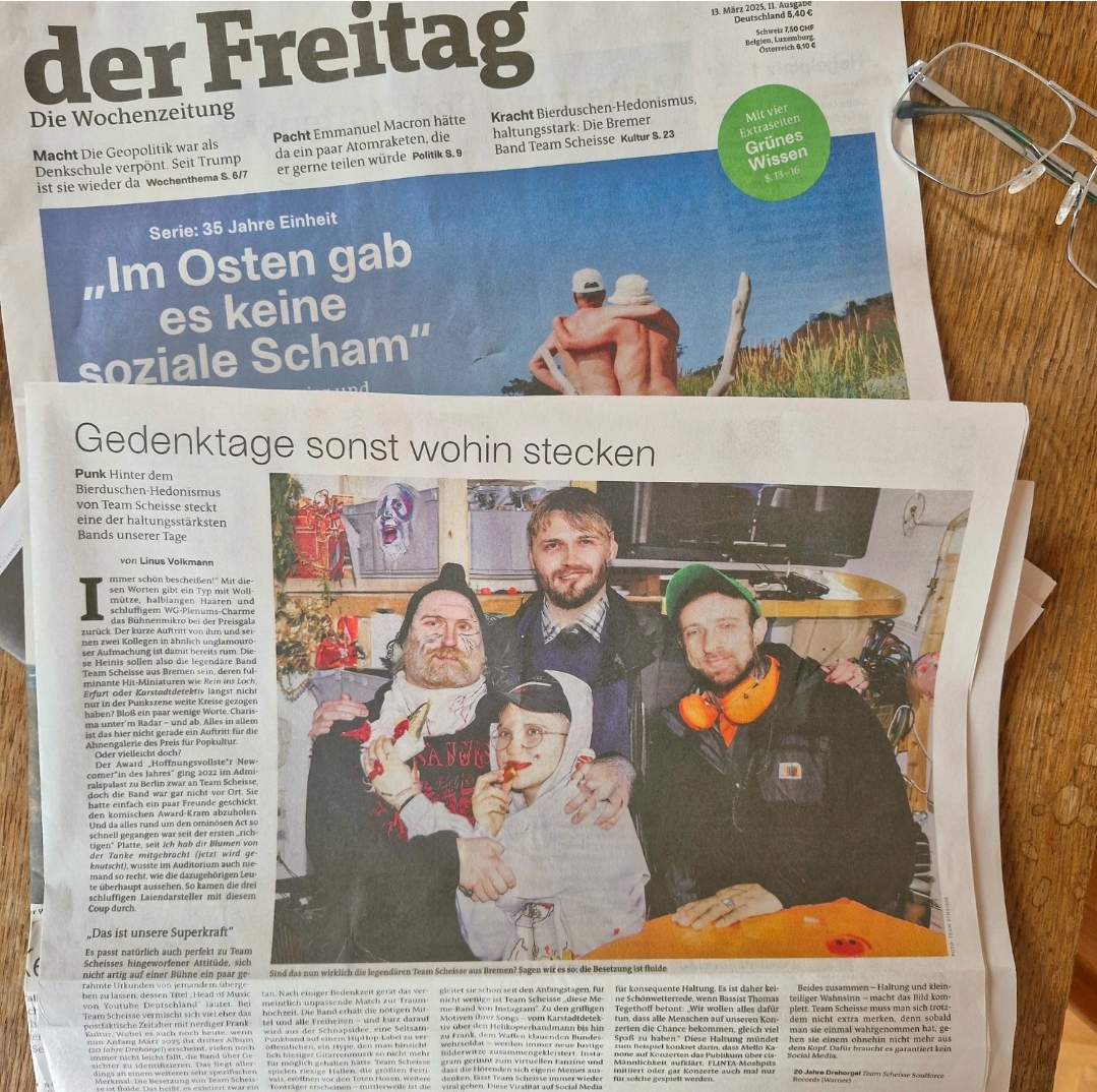 Hier fand sich anlässlich ihres neuen Albums ein Interview von mir mit Team Scheisse. Wo diese Zeitung ist? Ebenfalls ein Rätsel, allerdings habe ich davon ein Foto gemacht. Beweise, Beweise!