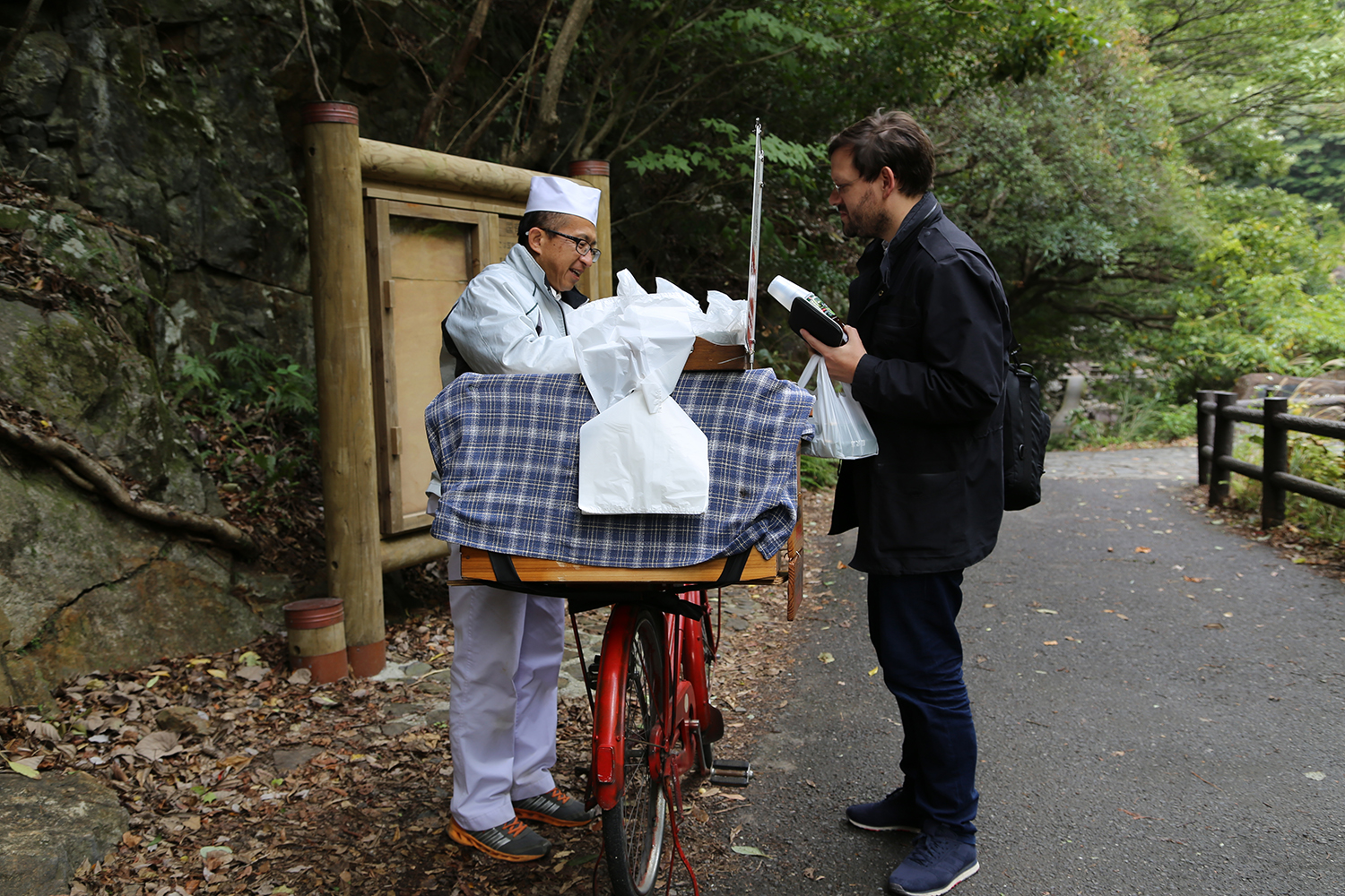 Zum Abschluss eine sehr schöne Begebenheit: Hier kaufe ich gerade eine Bento-Box von einem sehr freudllichen Verkäufer, der täglich zum Wasserfall auf Yakushima radelt und kurz vor dem verhungern stehende Touristen rettet. Oishi desu!