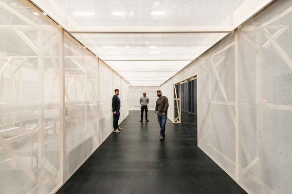 Wir haben mit einer Gaze gearbeitet, die durch die Bestrahlung mit Licht aus einer Richtung blickdicht und aus der anderen Richtung transparent ist. Hier bildet sich das Wort „Insight“, also Einblick, ab – da man von außen in das Innere einblicken konnte, dies aber von innen nicht mitbekam.