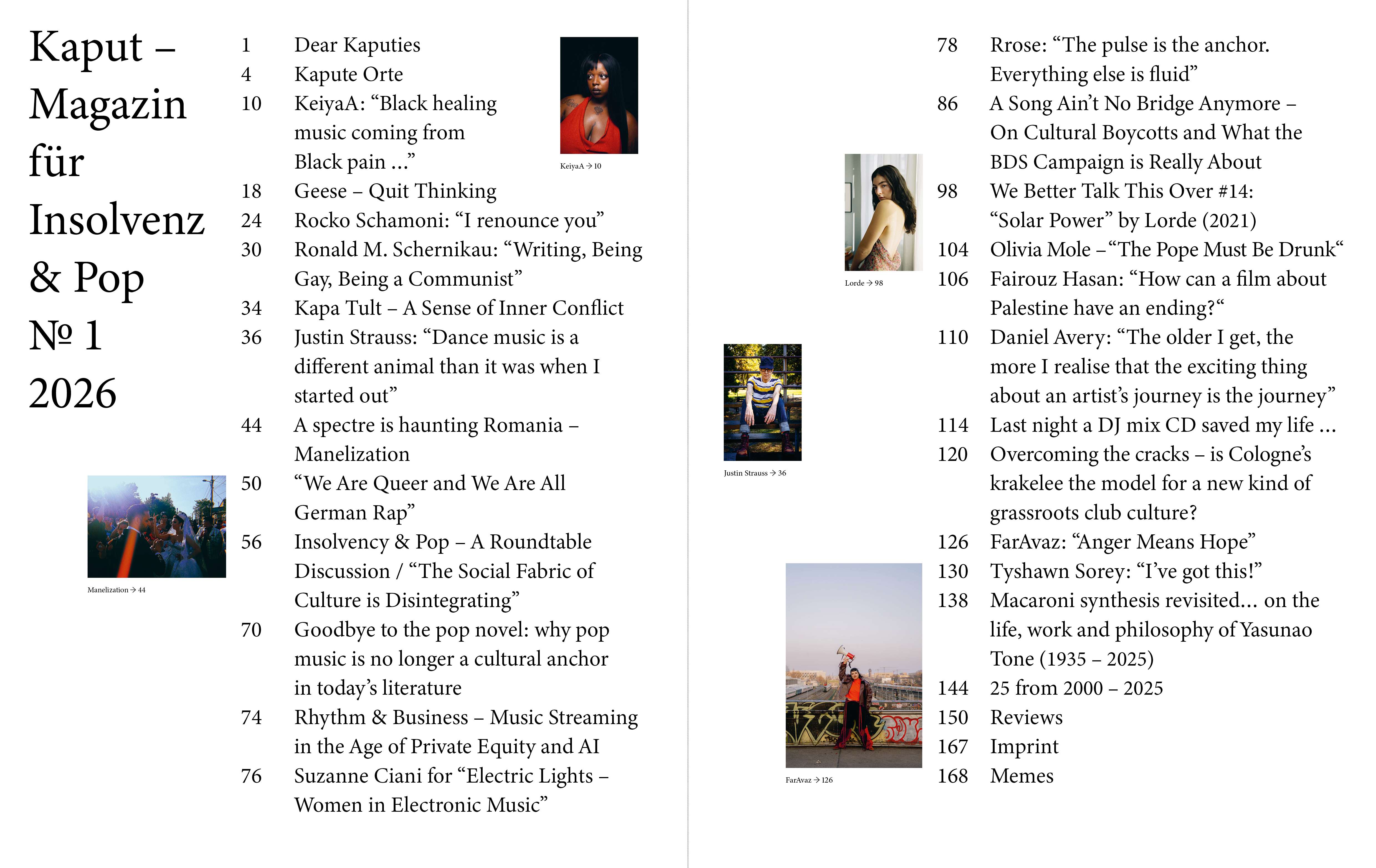 Hiermit gesagt, sind wir sehr gespannt, was Ihr uns zu diesem Erstentwurf auf 172 Seiten an Feedback schickt. Einige Abende für die Magazinpräsentation sind auch in Deutschland in Planung, denn wir wollen den Diskurs mit Euch gerne aus dem Magazin in die kaputen Orte wie HAU Hebbel am Ufer in Berlin, Kapute Szene in Köln, den Golden Pudel Club in Hamburg oder dahin, wohin Ihr uns einladet, bringen. Denn Kaput ist mehr als die Summe der einzelnen Mitarbeiter:innen-Stimmen, es ist der kulturelle Klangkorpus von uns allen.