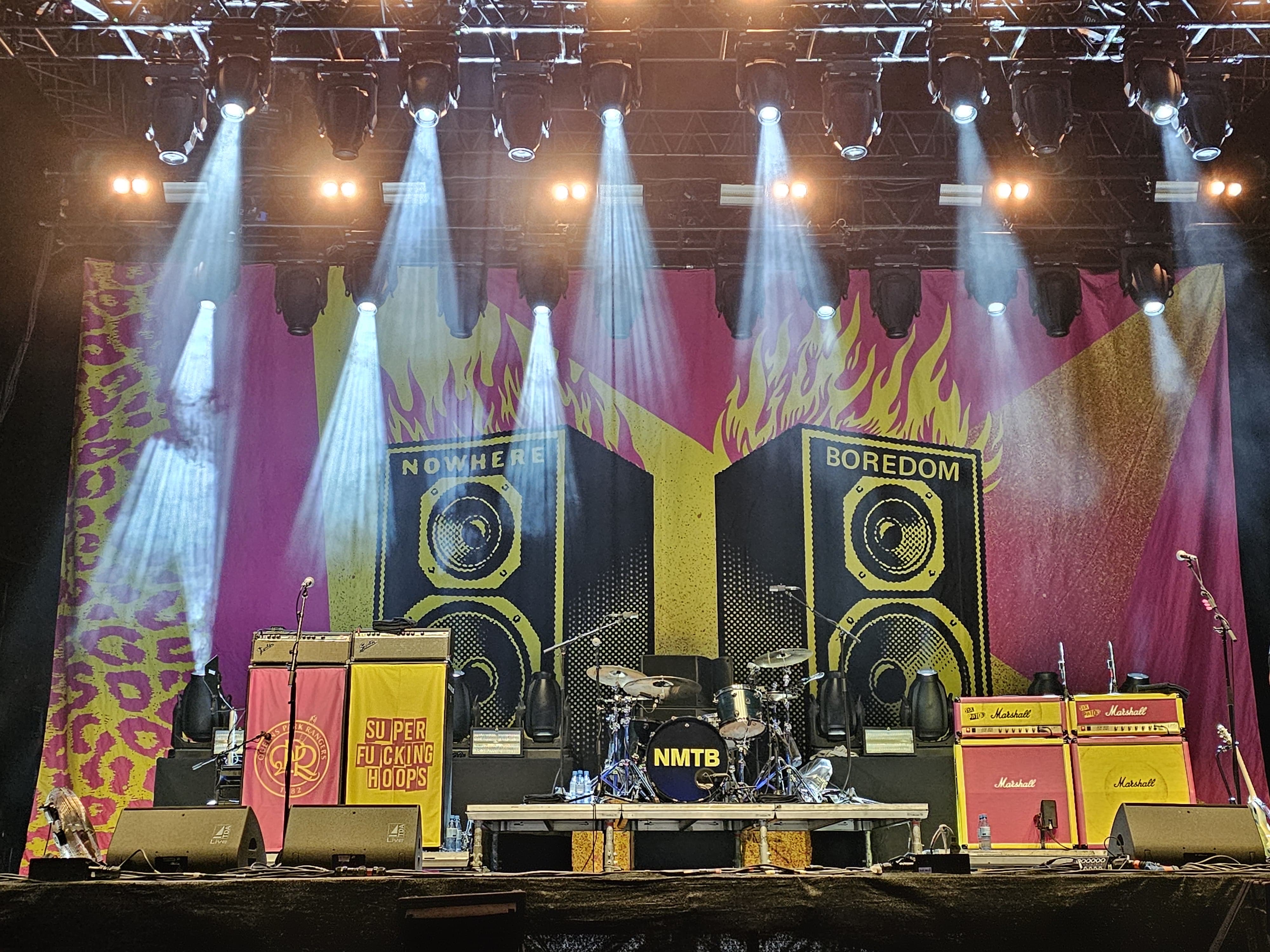 Festivals? Begeisterung sieht anders aus: Bands wie am Fließband. Bühnenlicht, das im Hellen nicht wirkt. Und ein Sound, der unter freiem Himmel verpufft. Lieber schaue ich mir ausgesuchte Acts in geschlossenen Räumen an. Auch im Sommer. Es regnet ja eh meist, wenn Festival ist. Aber einmal die Sex Pistols erleben, wenn man eh gerade mit dem Rad am Niederrhein unterwegs ist? Das lasse ich mir nicht entgehen! Also leiste ich mir die rund 90 Euro für ein Tagesticket und statte dem Ruhrpott Rodeo einen Besuch ab. Die Ankunft am Festival-Samstag ist erst für den Abend geplant, aber ich bin tatsächlich in erster Linie wegen der Sex Pistols da. Wenn es allerdings nach John „Johnny Rotten“ Lydon geht, dann sind die Sex Pistols in der aktuellen Formation nur ein Schatten ihrer selbst. Der angestammte Frontmann ist nicht mit von der Partie und tut die Auftritte seiner alten Weggefährten – Steve Jones (Gitarre), Glan Matlock (Bass) und Paul Cook (Schlagzeug) – mit Ex-Gallows-Sänger Frank Carter unter der Rubrik „Karaoke“ ab. Aber was will das schon heißen, angesichts der Äußerungen, die der zwischen Wahn- und Irrsinn mäandernde Provokateur und Trump-Befürworter Lydon sonst so von sich gibt. Die Brand „Sex Pistols“ zieht jedenfalls noch immer – auch ohne Sid Vicious und Johnny Rotten. Das Bühnenbild mit dem in neon-gelb und pink strahlendem Equipment und dem ikonografischen Schriftzug reicht aus, damit man das Gefühl bekommt, gleich Teil von etwas ganz Großem zu sein. Dafür braucht es keine Akkorde; es muss auch niemand auf der Bühne stehen. Dass die Show die (Marshall-)turnhohen Erwartungen nicht ganz einlösen kann – irgendwie klar. Aber, hey, ich habe die Sex Pistols gesehen. Und das war um Längen besser als das, was vorher The Damned auf der Bühne nebenan zu bieten hatten…