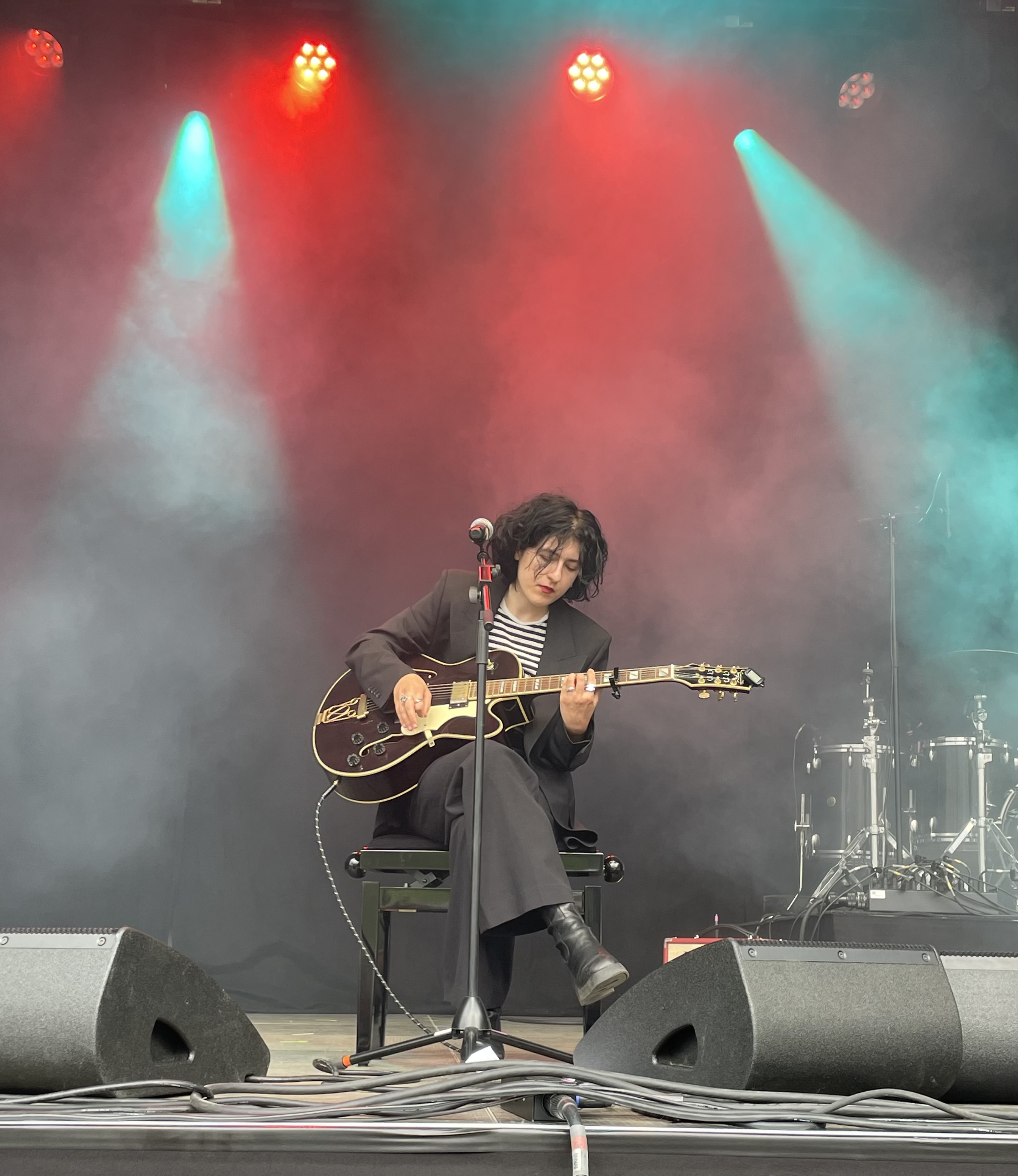 Insgesamt elf Bands treten an den drei Tagen auf. Das ist übersichtlich, Festival-FOMO kommt da nicht auf; hier braucht niemand mit dem Time-Table in der Hand hektisch zwischen den Stages hin- und her pendeln. Es gibt eh nur eine Bühne. Und dennoch ist das von Gisbert zu Knyphausen und Benjamin Metz sorgsam kuratierte Festival breit aufgestellt. Vor zwei Jahren, bei meiner Heimspiel-Premiere, teilten sich The toten Crackhuren im Kofferraum und Martin Kohlstedt die Bühne, in diesem Jahr reicht das Spektrum von melancholischen Singersongwriter-Klängen über Jazz und Blues-Rock bis hin zu Post-Punk und populären Beats. Den Anfang macht Edna Million, die es jedoch mit ihrer introvertierten Art nicht leicht hat, sich gegen das Stimmengewirr auf dem Rasen durchzusetzen. Ihre runtergedimmten Songs, die sie mit der halbakustischen E-Gitarre solo vorträgt, kämen sicherlich in einer verrauchten Kellerbar besser zur Geltung als unter dem (noch) strahlendblauen Himmel im Rheingau-Idlyll. Viel Schwermut liegt in ihrer rauchigen Stimme, auch damit zündet die Wienerin das in freudiger Erwartung gestimmte Publikum nicht an. Zugewandter – um nicht zu sagen gefälliger – ist der Sound von der Jazzformation Tonbruket, von den Veranstaltern schon seit längerer Zeit umworben. Das Quartett aus Schweden harmoniert in der Instrumentierung Kontrabass, Schlagzeug, Keyboards und E-Gitarre bestens, wie bei Profis dieses Genres nicht anders zu erwarten. Insbesondere Gitarrist Johan Lindström setzt dabei die Akzente und schlägt die ersten rockigeren Töne des Tages an.