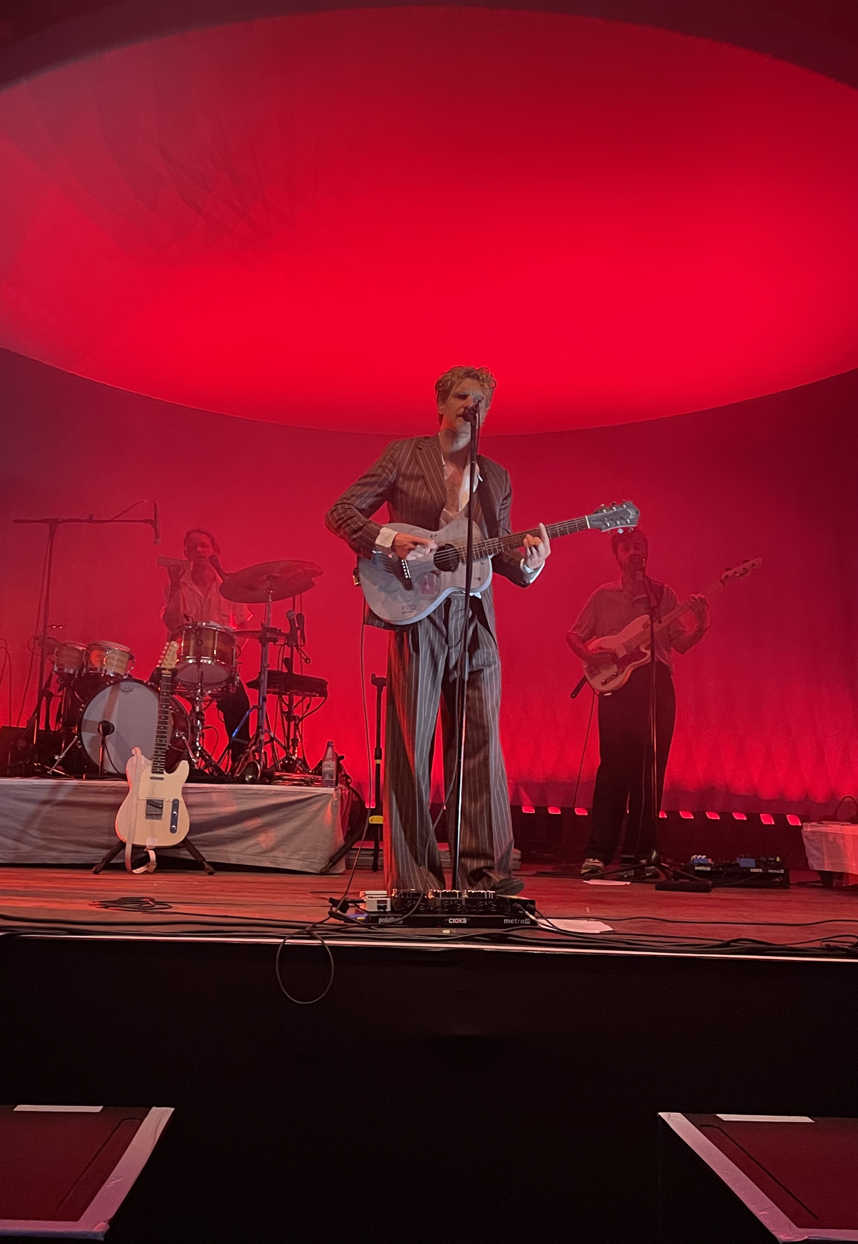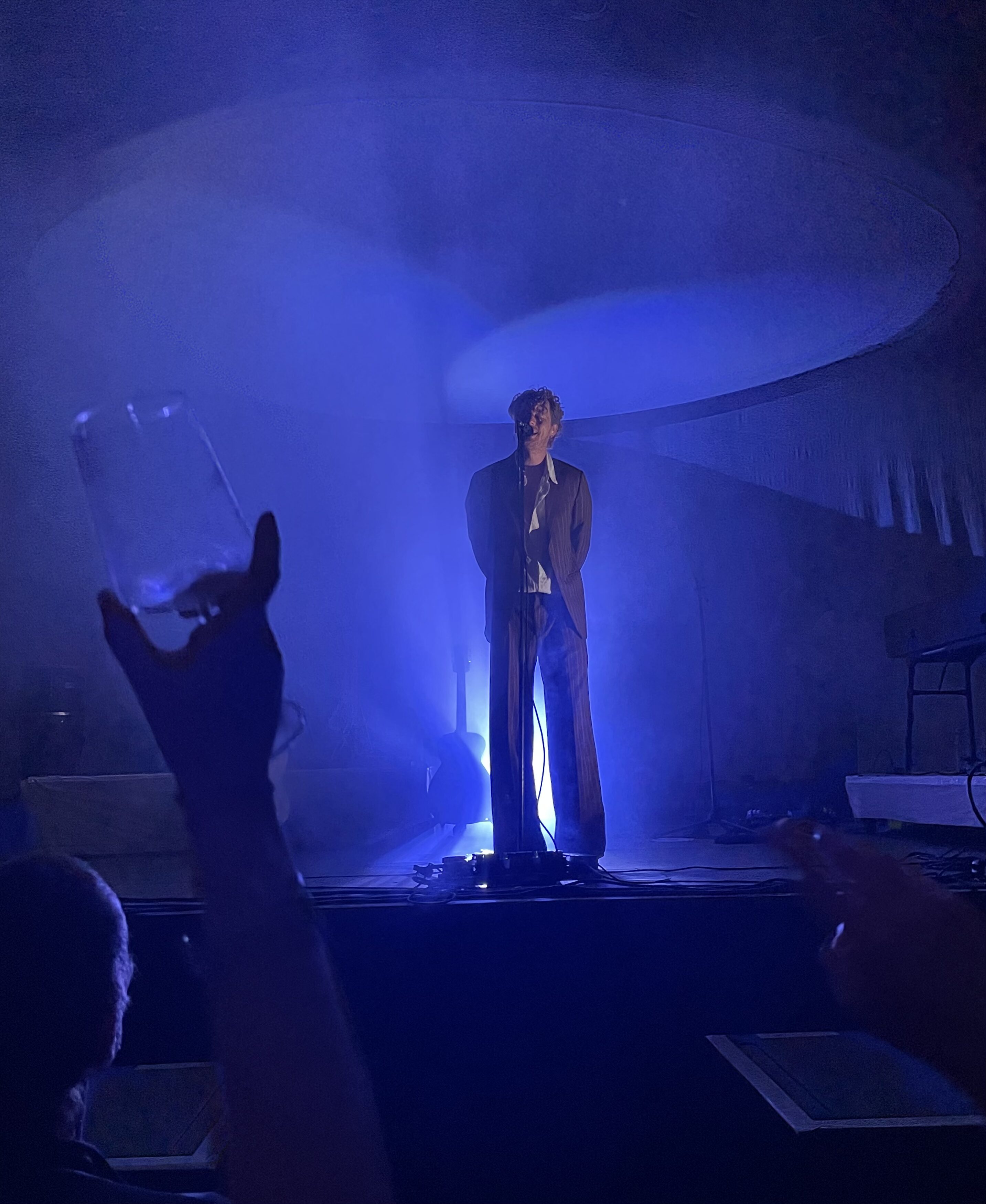 Ohne Zweifel: die Stimmung ist relaxed, das Wetter besser als gedacht, und der Riesling verkauft sich flaschen- manchmal gleich kartonweise. Der Eindruck, dass es sich beim Heimspiel Knyphausen um ein verkapptes Weinfest mit Musikuntermalung handelt, mag sich anfangs aufdrängen. Spätestens mit dem Auftritt von Warhaus wird er zerstreut. Die Decken auf der Wiese werden zusammengerollt, vor der Bühne wird es enger, und wer von der eindringlichen Performance des hochaufgeschossenen, blondgelockten Sängers nicht allmählich in den Bann gezogen wird, der liegt vermutlich längst mit Sodbrennen im Weinstock. Maarten Devoldere kenne ich eigentlich von der belgischen Band Balthazar, bei der er sich die Führungsrolle zusammen mit seinem Bruder teilt. Bei seinem Solo-Projekt steht er allein im Zentrum und scheint dies sichtlich zu genießen. Seine dandyhafte Lässigkeit – vor allem die Art, wie er Howard-Carpendale-like das Mikro von unten hält – mag dem einen oder anderen sauer aufstoßen, musikalisch aber werden wir von Warhaus in ein wohliges Bad voll zuckersüßer Pop-Melodien geworfen. Endlich ist es auch dunkel, und das Bühnenlicht entfaltet ebenso seine Wirkung wie die illuminierte Deckenkonstruktion, die wie ein Ufo kurz vor der Landung über der Band schwebt.