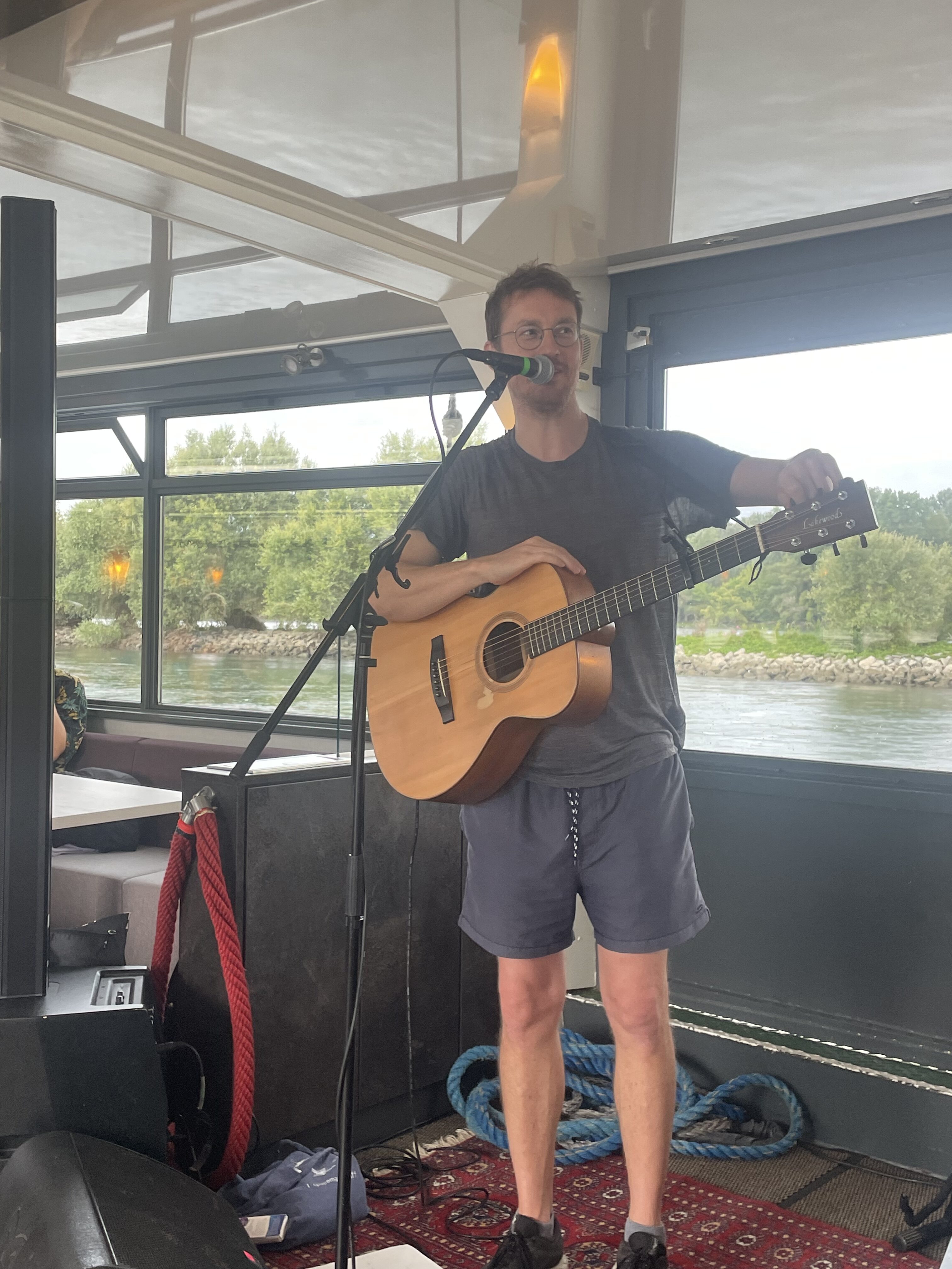Ein weiterer Festival-Höhepunkt ist die Schiffsfahrt am Folgetag. Der Heimspiel-Liner legt bereits um 11 Uhr ab. Es ist die erste Tour, eine weitere Runde auf dem Rhein wird zwei Stunden später gedreht. Beide Mal an Bord: der Singer-Songwriter Hannes Wittmer. Unsere Gruppe erwischt die Regenfahrt; als wir wieder anlegen kommt die Sonne raus. Aber Songs wie „Die Beschissenheit der Welt“ passen einfach besser zu Grauschleier und Nieselwetter; wir haben definitiv den passenderen Zeit-Slot erwischt. Mir kommt ein Zitat von Sven Regener in den Sinn: „In der Kunst ist die Traurigkeit schön“. Hannes Wittmers Lieder, die er mit der Akustikgitarre vorträgt, sind der beste Beweis dafür. Zudem ist er ein guter Unterhalter, der die trübe Stimmung, die aus vielen seiner Texte spricht, mit pointierten Zwischenansagen aufhellt. Auch sonst hat Wittmer, der früher unter dem Namen Spaceman Spiff aufgetreten ist, viel zu erzählen. Es lohnt sich nicht nur, seine Platten anzuhören (Anspieltipp: „Vorwärts ist keine Richtung“), sondern auch in seinen Blog reinzulesen, in dem er sehr offen über seinen Umgang mit Depression und den Verwertungsmechanismen in der Musikindustrie spricht.