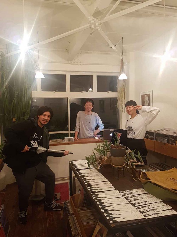 Wir lernen uns dort kennen, wo man Musiker_innen abseits von Clubs am besten kennenlernt. Im Plattenladen. Hino ist mit seiner Freundin, der Musikerin Yuko Kureyama mit der Keihan-Bahn aus Osaka nach Kyoto gekommen, um im Meditations Plattenladen die neusten Tapes seines Labels birdFriend auf Kommissionsbasis abzugeben. Wir nutzen die Gelegenheit, um ein bisschen mit dem Betreiber des Ladens, Yoshiihisa Shiotas, über die lokale Musikszene zu sprechen, danach gehen wir in ein nahegelegenes Restaurant.