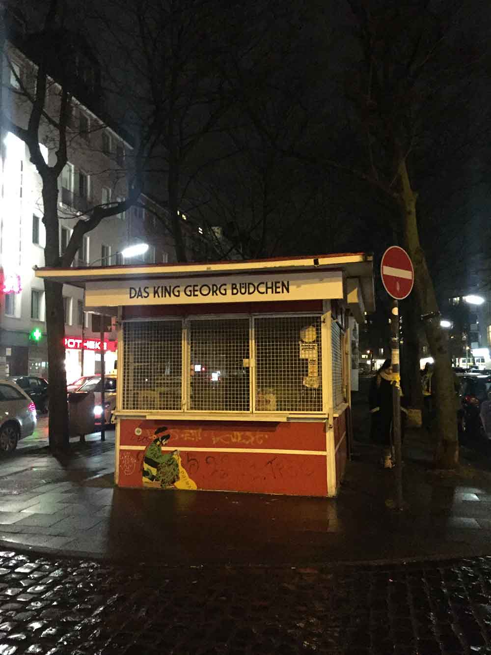 Über die großen Einschlaglöcher will ich jetzt gar nicht zu schreiben beginnen (sie sind in der folgenden Gesprächsrunde sowieso nicht zu vermeiden), aber auch die Erkenntnis, dass das King Georg, das doch gerade erst aufgemacht hat und seitdem eben ganz casual da vorne am Ecke am Ebertplatz steht, bereits seit zehn Jahren existiert ist so ein Momentum, das nachdenklich stimmt.