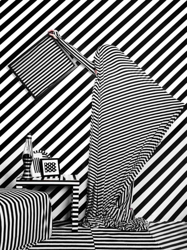 I have other work that is more complex and intellectual, prop laden, uses projection, music, words, etc. But this is so simple and yet the people loved it. Since then, black and white stripes have kind of become my brand. A few years ago I started working with a wonderful photographer, Eric Schwabel. We created the first “Striped World” room in his studio. These images show the striped figure in a domestic atmosphere. And one of these photos garnered first place in the One Shot: One World International Photography Awards in 2014. Eric and I continue to work together producing an incredible portfolio of images. Of late we have been going out into nature – big, expansive locations are in abundance in California like the Mojave Desert, Joshua Tree, the Poppy Reserve.