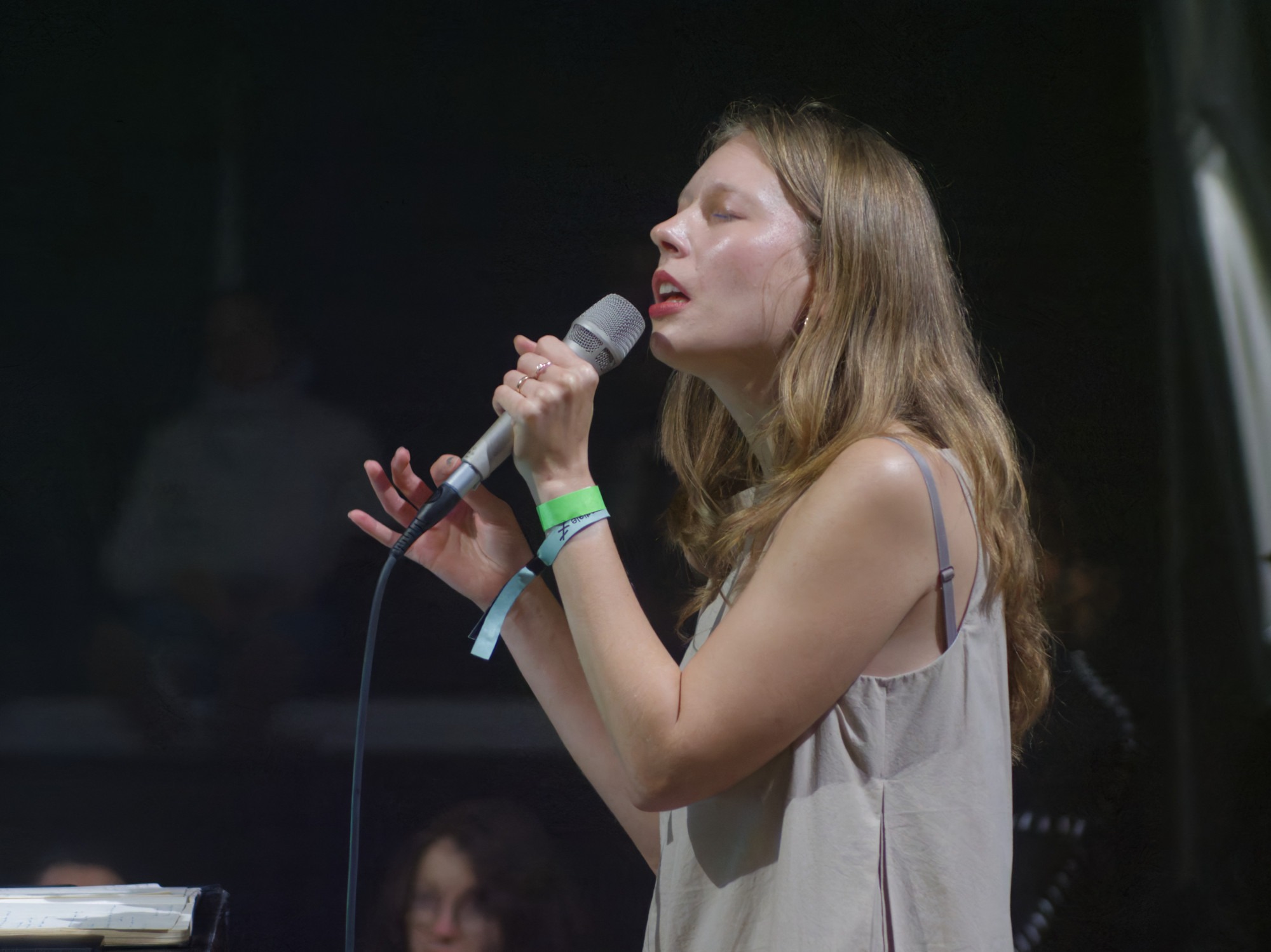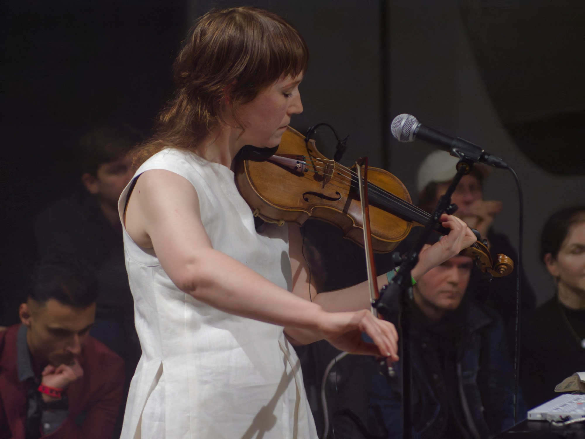 Their performance was built on songs by Slovak vocalist and composer Adela Mede, who combines in her lyrics the three languages she grew up with – Slovak, Hungarian (her parents’ mother tongue) and English. She was joined by an artist whose work she has long admired, Swedish composer and sound artist Marta Forsberg, who accompanied Mede’s songs with violin, electronics and voice, and donated one of her very own songs for the finale. Nindya Nareswari, an Indonesian light designer, now based in Berlin (like Forsberg), transformed the Kuppelhalle through an interplay of light, fog and large sheets of reflective foil.